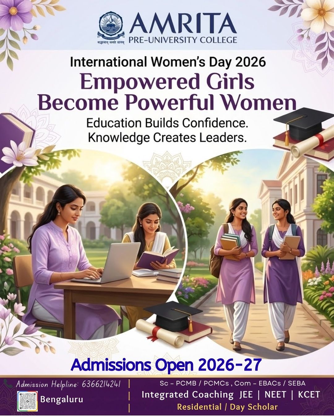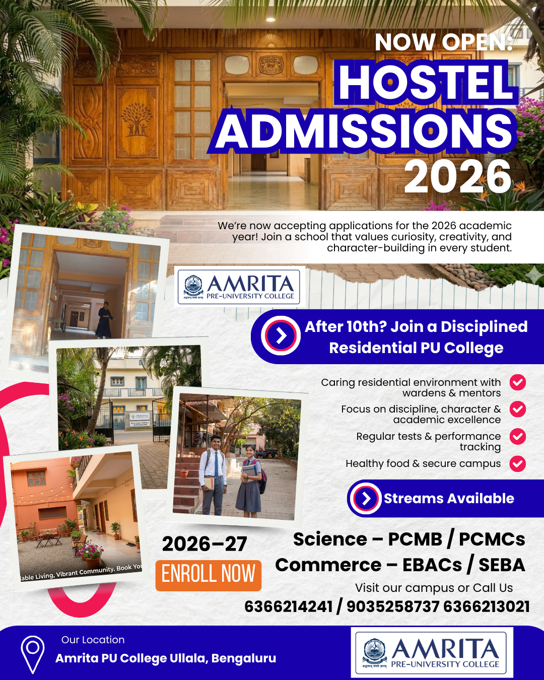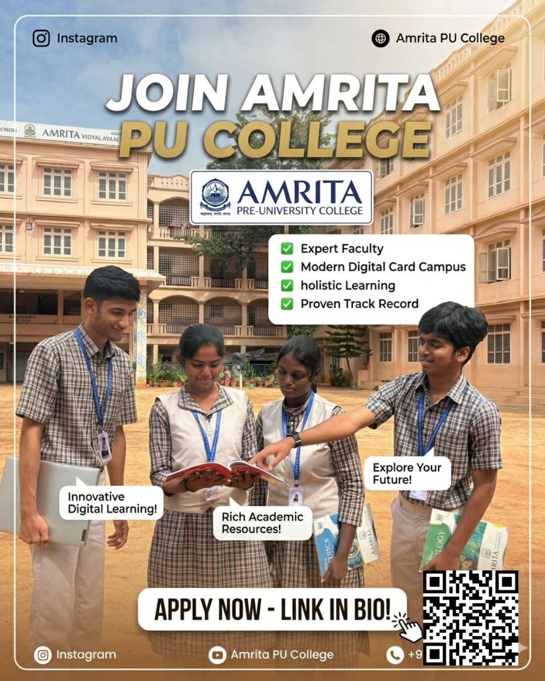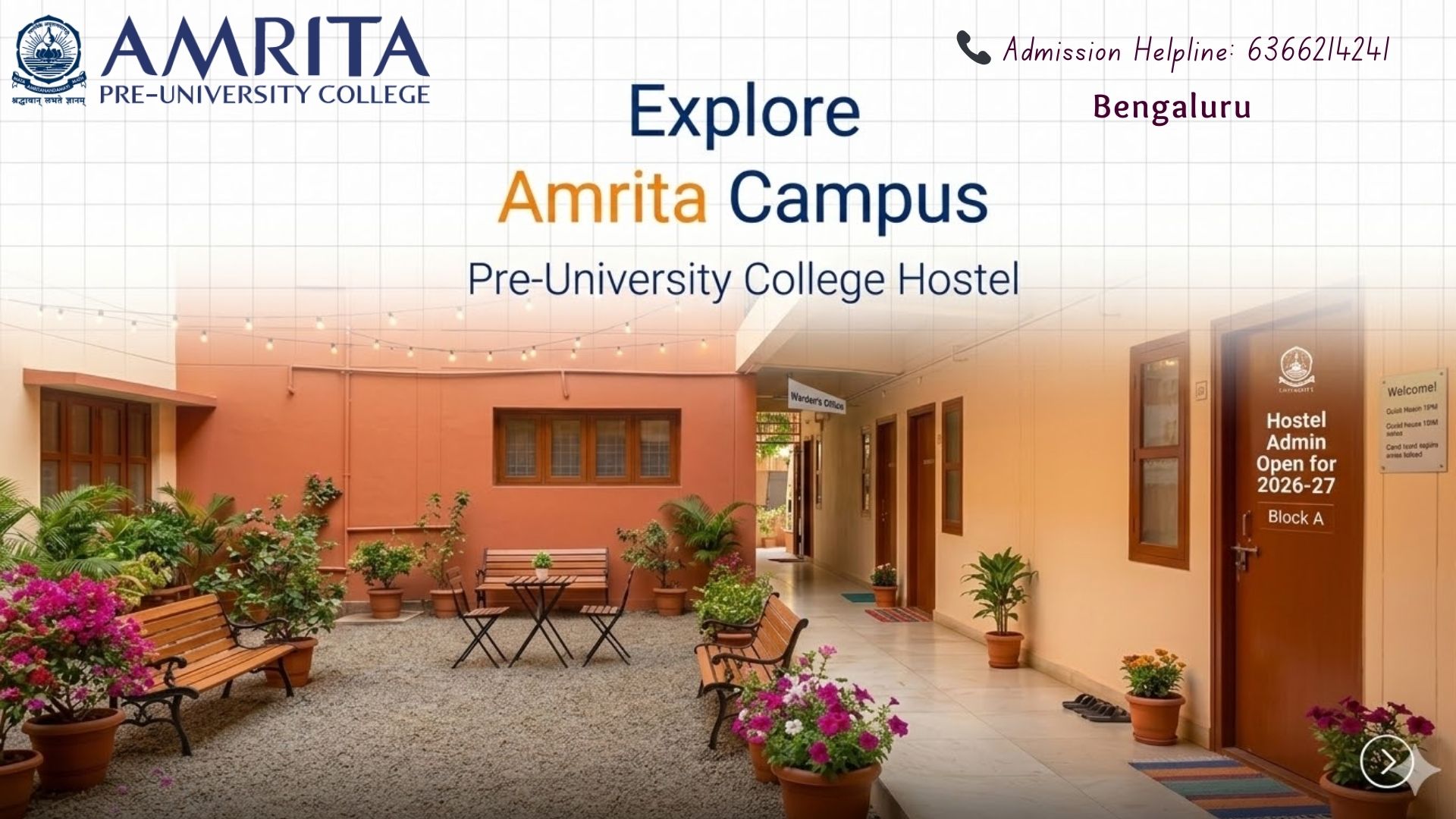 Amrita PU College, Blr offers Science (Integrated JEE/NEET - PCMCs, PCMB) and Commerce - Day scholar / residential. Expert faculty & safe hostel.